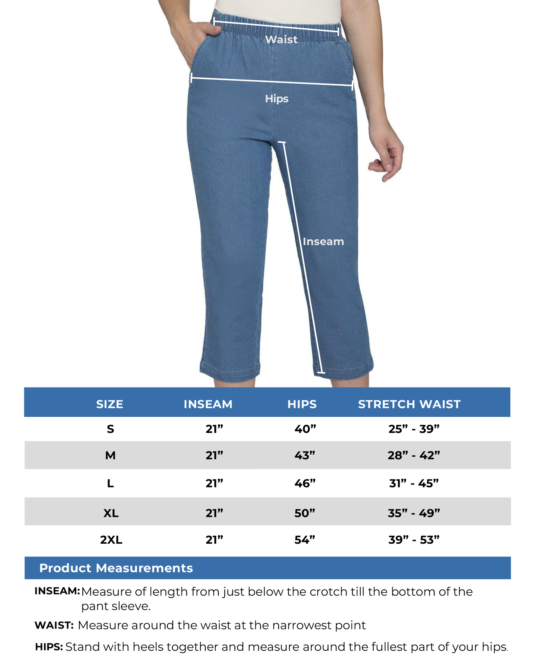 Our Women's Denim & Twill Stretch Capris are the perfect choice for lounging in style. Crafted from a lightweight tri-blend fabric of cotton, polyester and spandex, these capris offer the ultimate comfort with just the right amount of stretch. Designed with angled pockets for easy access and an elastic waistband for effortless wear, these capris eliminate the hassle of zippers and snap buttons. Pair them with a smart top, casual shirt, or tunic for a relaxed look, perfect for a garden picnic or casual outings.